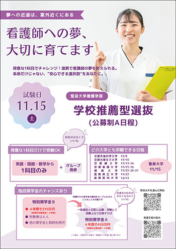 他大学の看護学部の入試もこの時期に集中しますが、本学の試験日(11/15)と滋賀県、京都府の看護系大学の試験日は重複していないので、